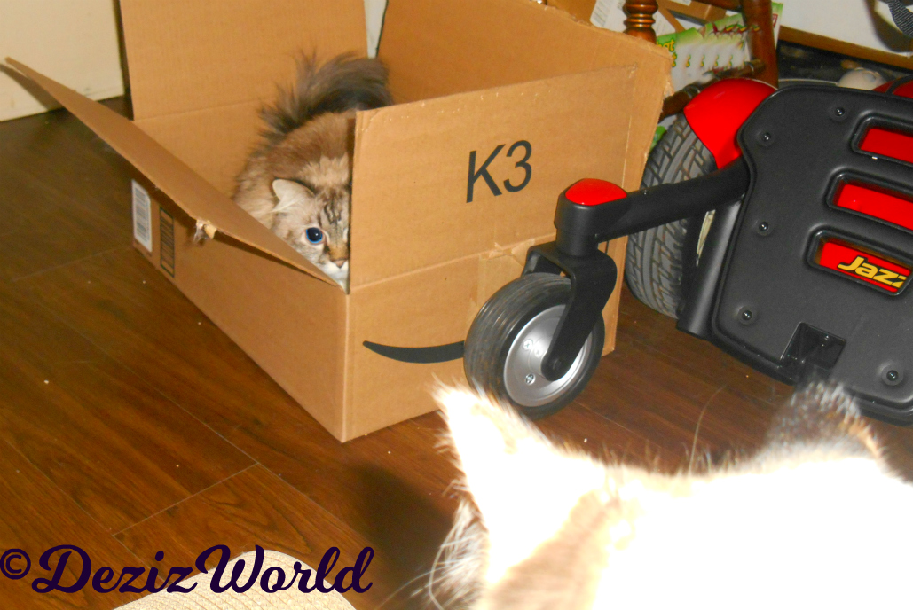 You’re not Raena, you’re just s’posed to accept it and be glad that mommy takes good care of us. Now, me thought we were gonna meow ‘bout that box we got just in time fur your Birthday last month.