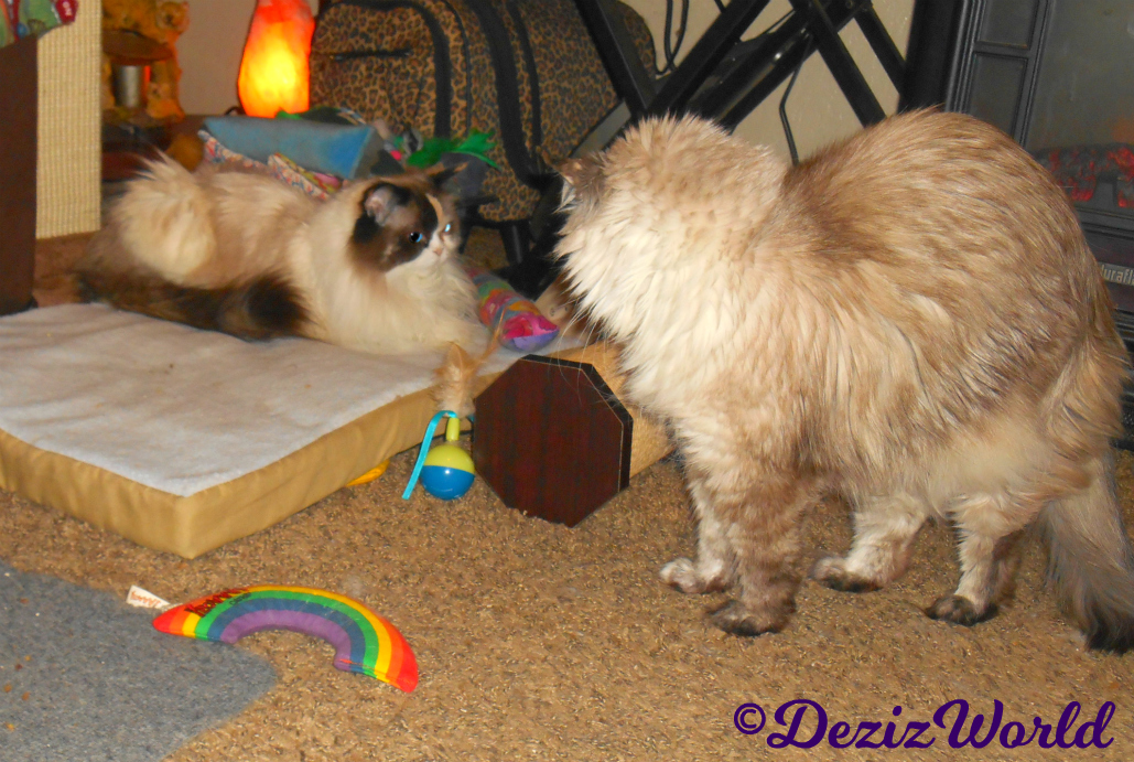 (Raena runs after Dezi meowing) Wait!!! Sissy, I’s didn’t call mommy fat, you did. I’s can run faster than you. Besides, I’s the baby, who do you think mommy’s gonna believe? I’s gotta hurry and finish mine’s brekky so we can get ready to go to Tishomingo today. Fanky fankfully, it’s not s’posed to storm today. Maybe we can stop fur some special treats. Ifin you don’t tell mommy, I’s’ll bring you somethin’ back?.