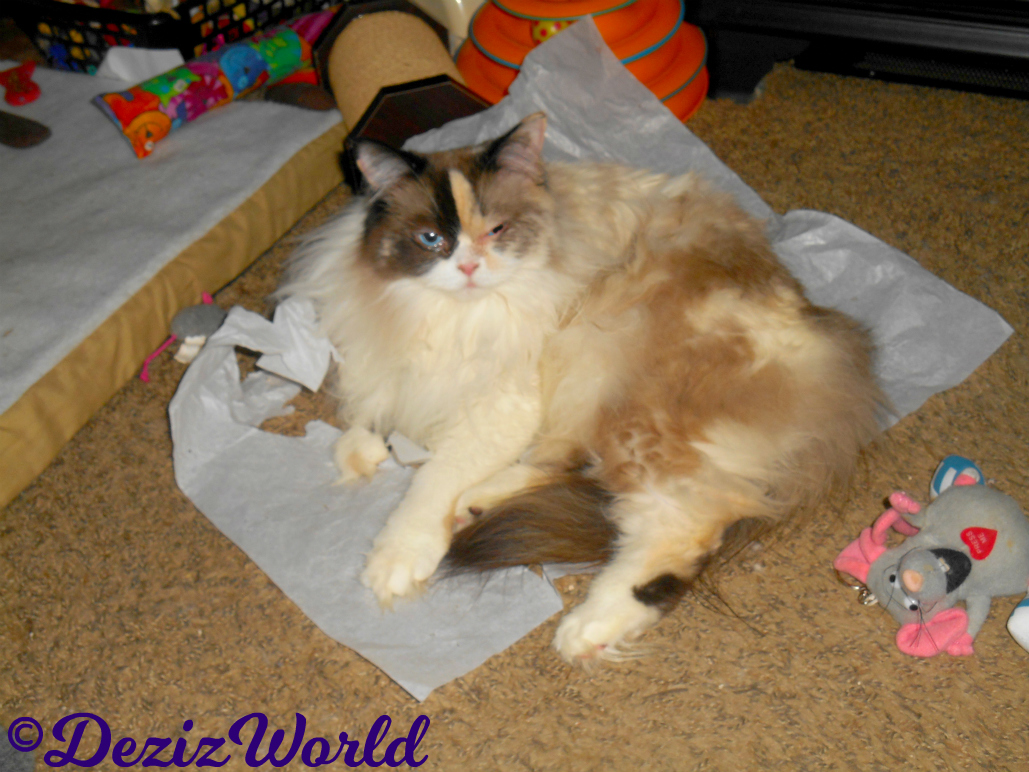 Oh sissy me luvs this time of year. All da blinky lights are so purretty. And da smell of mulled cider and sugar cookies from mommy’s candles and oils are so yummy. (don’t leave your pets unattended with flames from candles or oil burners) Me just hopes she furgets ‘bout da santa suit she got fur us last year, don’t you? And hey, did you notice we have a new header and background fur our bloggy?