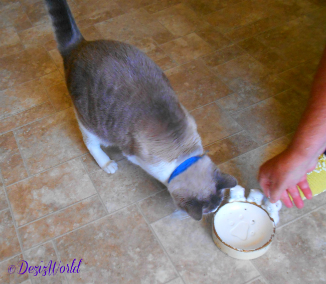Buddy: Y thank ya’ Dezi. Ya’ know my pops usually keeps my foods in da bottom cabinet so it was purretty strange to see da bag in da middle of da floor. But I was sure interested in checkin’ it out. Since your mommy had opened it, I kuld smell it purrmeatin’ thru da bag. I may not have as good of manners as you and Lexi, but even when your mommy opened da bag I didn’t immediately jump in. But when your mommy took a few pieces out and put ‘em down fur me I kuldn’t gobble ‘em up fast enuff, flashy box or not. After those few pieces, pops put da bag away and said I’d start da challenge da next meownin’ at breakfast. I really kuldn’t wait. So all in all, I’d say my furst impressions was all paws up.