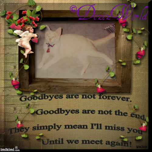 Well furiends lookin’ back over da munf we realize we’s lost so many sweet and dear furiends dis munf. Meez told you dat mommy wus feelin’ kinda blue wif Lucky’s Meowday comin’ up tumorrow so me fawt tunite meez wuld honor all those hoo hav gone tu heaven. Meez wandid tu du it tunite cuz meez and sis Lexi intend tu keep mommy completely occupied tumorrow so her dusn’t hav time tu miss Lucky or anypawdy else. 🙂 So tunite is fur all of you hoo hav lost a luved one. Just know dat even tho’ dey not be here anymore you did all you could fur dem and dey are in a much better pllace now. Mommy sez her mansion in heaven is full of luv and kitty fur and happy purrin’ kitty’s. Til da nex time,