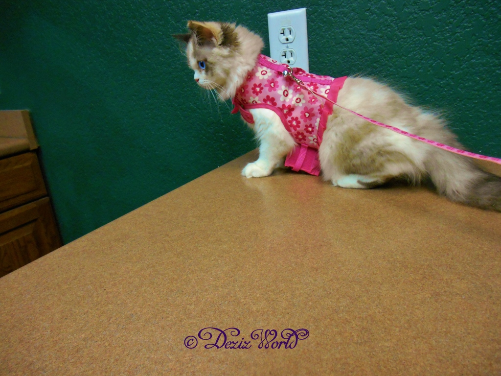 Furst up was da big scale, where I’s weighed in at just over 3 pounds. 3 pounds 1 ounce to be exact. I’s growin’ up. Anyways, we then headed to a room where mommy decided it was time fur an impurr-omptu foto shoot of me in minez oversized pink fashion dress. We were rudely innerupted by da lady in da white coat and her assistant. Seems Dr. C’s new VET is takin’ over more and more. Well da assistant purromptly grabbed me outta mommy’s hands and scruffed me. Looka’ here, just cuz I’s a Ragdoll with a docile nature doesn’t give ya’ da right to be mean. And it certainly doesn’t give ya’ da right to take me from mines mommy. She gotta hiss and a bitey fur her trouble. Hmmfft Guess she’ll know better next time. While I’s scurried back to mommy, things seemed to be takin’ a turn fur da better when da doctor started cooin’ over me in mines purretty pink oversized dress.
