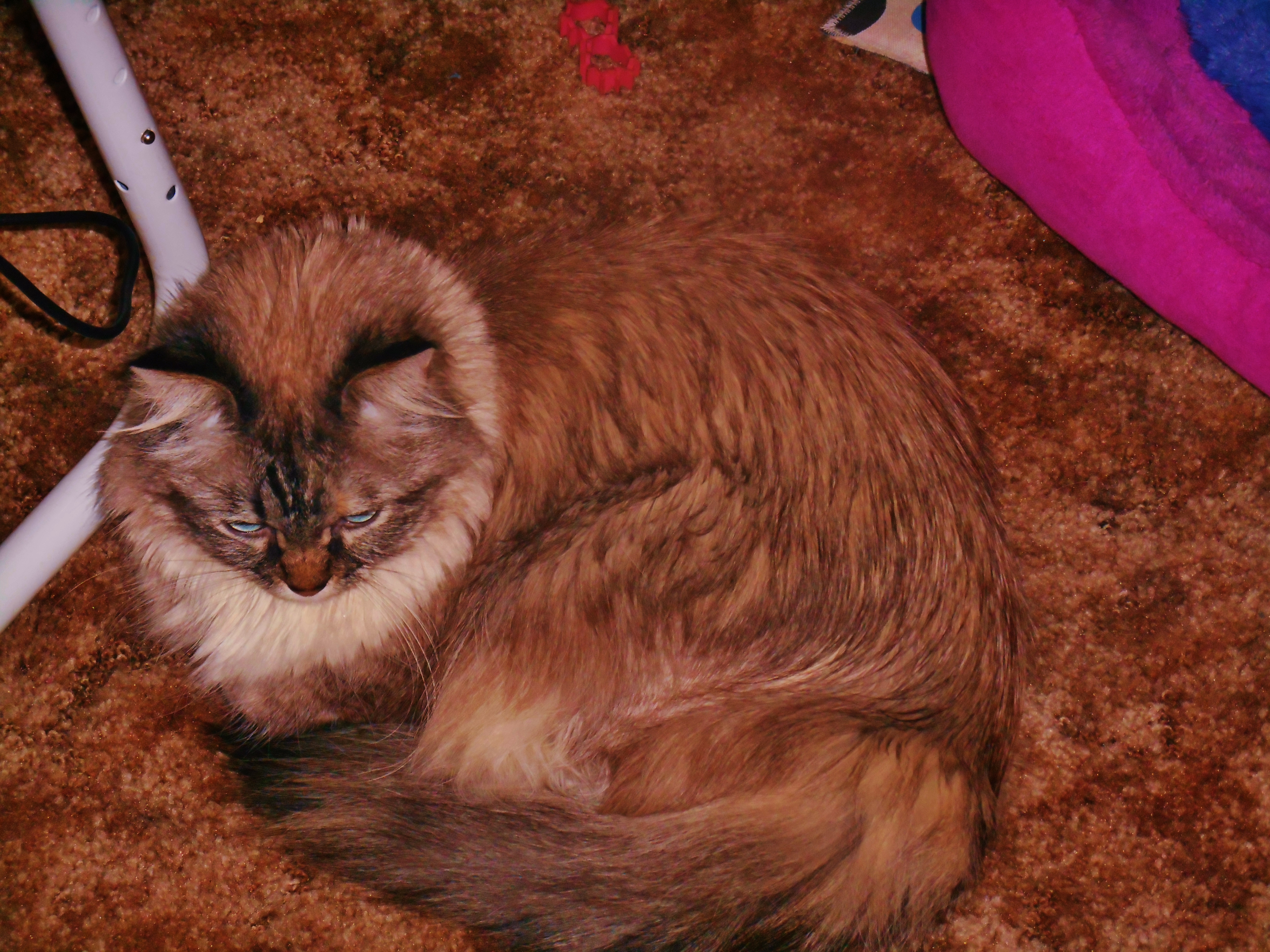 We went to Wally World to get Dezi and me sum treatz. Dat place waz buzzin’. I’z not member da lazt time I saw dat many peepz in one place. Mommy waz tryin’ to drag da buggy and da stroller down da ailez and a man kame up behind us and sed, “Lookz like you’ve got your hands full.” Mommy smiled and sed, “Just about.” He walked past us and then turned to look my way and himz jaw dropped. He sed, “That’s a cat!!! I thought you had a baby in there.” To which hiz wife responded, “that’s her baby.” Mommy smiled, I meowed and we all went on ‘bout our shoppin’. It stormed da whole way home, but I was glad to be back home with da lektrik fireplace and awl my stuff and Dezi. It waz kold out there. When we got inside I star-did runnin’ round and aktin’ like a kitten again. I so lubz to go placez wiff mommy. I juzt wish we didn’t habz to go to da place of evil.