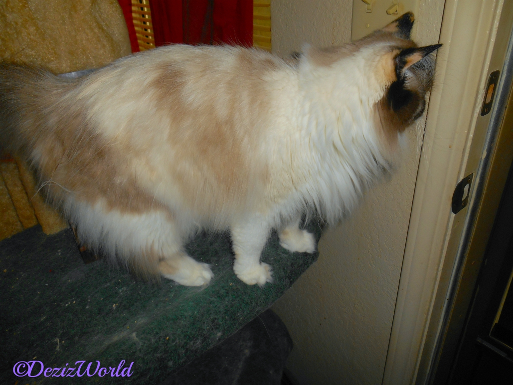 Hey, is anypawdy out there? It’s me, RaenaBelle, comin’ to ya’ from mine’s perch at the door. Yep, I’s spend a lot of time lookin’ out the door each day. Some days there’s more to see than others, but I’s do like lookin’ out. Today started out with the manager inneruptin’ our brekky fur an inspection. To be fair, we weren’t actually eatin’ yet, mommy was still makin’ it. I’s think that’s actually worse, cuz it meant our brekky was delayed by like a bazillion minutes.
