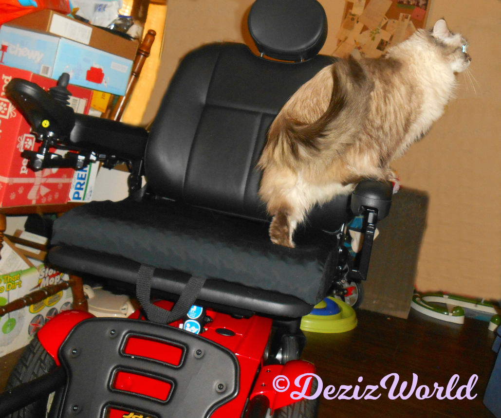 It took about 3 months before Lexi was comfortable enough around the chair to even ride in it. It was her brother Lucky that gave mommy the idea to train them to drive it. At the time, it was the only chair mommy had, so she sat in it most of the time. One night she and Lucky were relaxing in the chair watching television when he got up, pushed the power button, bit the joystick and propelled them forward. He seemed a bit shocked, but didn’t jump down. Lexi came running over and jumped up in mommy’s lap too. Mommy moved the chair back to where they had been and Lucky proceeded to repeat his actions. This happened over and over that night until mommy plugged the chair in and they went to bed. The next morning when mommy awoke, Lexi was sitting in the chair biting the joystick and trying to push it. A wheelchair will not operate when in charging mode.