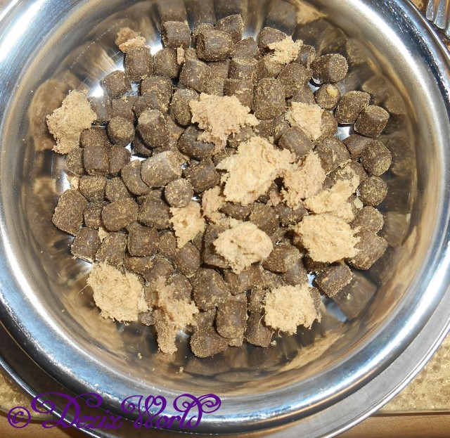They look like little cylindrical pellets and have a crunch to them. Ifin you’re tryin’ to get your kitty off of da dry kibble they wuld make a gweat topper to get fluffy eatin’ better. Da pieces vary a little in size, and me’s a picky girly and likes everythin’ to be bite size; so mommy has to bweak up da larger pieces. Mommy sez they’re not so hard dat her arthritic hands can’t manage it. And they be made here in U.S. facilities. They come in a 6 ounce bag and fur kitties they come in 2 flavors, chicken and da rabbit we tried. Now dat da business be behind us, let’s get on wiff da eatin’. Sissy why don’t you tell everypawdy what you think ‘bout da Instinct Raw Boosters Mixers?