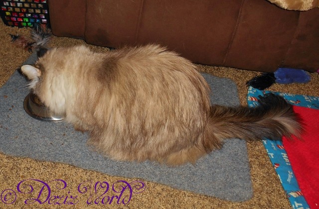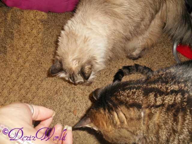 Fanks sissy. Me’s gotta tell ya’ me worries da same thing. Anyways, glad you like ‘em. Now on to me’s ‘pinion. Me has never been da kitty dat meowed fur her meal. Me waited patiently and quietly fur mommy to bring me’s plate. Well not anymore. As soon as me can see dat mommy has da food in our plates, me runs to da livin’ room where me eats and starts meowin’ fur mommy to hurry up and bring me’s plate. As me sed earlier, mommy has to bweak up da larger bits but me licks da plate clean. So me gives these Mixers 4 paws up too. So dat’s 8 paws up fur da Instinct Raw Boost Mixers. Mommy, what do you think?