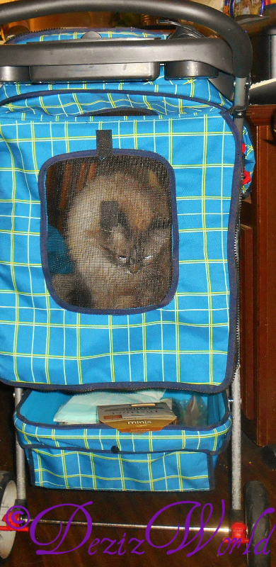 The next step was and is to work on Dezi’s stress levels. To do that we’ve been taking some days off the computer to hang out together and play and go for strolls. Dezi loves to play and she really likes to go out and see people and things. Kitties that lay around and sleep all the time can be stressed. Altho’ cats do sleep more than most species, they need enrichment during their waking hours. Their ancestors had to hunt for their food, so a little playtime before a meal can be beneficial. And altho’ I don’t believe any cat should be outside unattended, there’s a benefit to fresh air and sunshine. So invest in a good harness and leash and take the time to train your cats to use it. I have always preferred those harnesses made more like clothing as opposed to the strappy ones. A cat feels more secure when wrapped and even tho’ they may not like the harness at first, they will grow accustom to it and even someday enjoy it. We also use a stroller for going out. I’ll tell you they are a great investment. A way to take kitty out while keeping them completely protected.